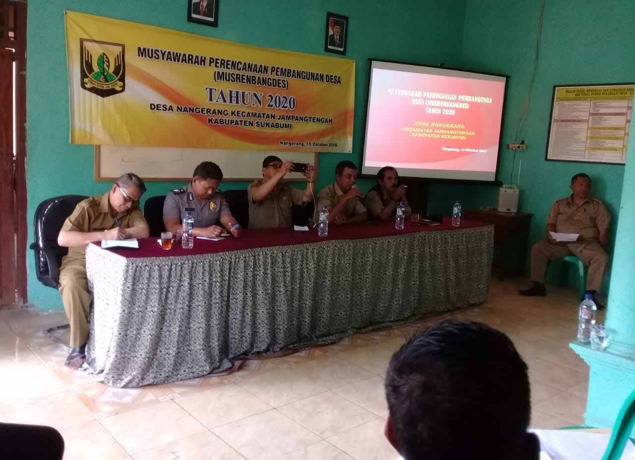 JAMPANG TENGAH — Pemerintah Desa (Pemdes) Nanggerang Kecamatan Jampang Tengah Kabupaten Sukabumi Jawa Barat, adakan Musyawarah Perencanaan Pembangunan Desa (Musrenbangdes) tahun 2020 di Aula Desa Nanggerang Senin, (15/10/2018). Kegiatan tahunan tersebut dihadiri sedikitnya 38 peserta yang terdiri dari pemerintah desa, BPD, LPMD, karang taruna, tokmas, tokoh perempuan, PKK, tokoh agama, pengerak kompepar desa, bidan desa dan lainnya.