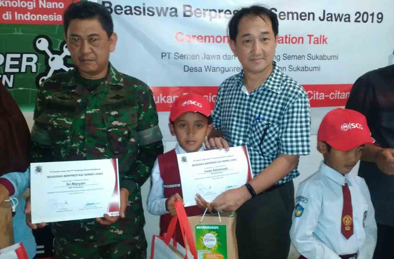 NYALINDUNG — Puluhan siswa Sekolah Dasar Negri (SDN) Wangunrejan Desa Wangunreja Kecamatan Nyalindung Kabupaten Sukabumi Jawa Barat, terima beasiswa dari Pemerintah Desa (Pemdes) Wangunreja yang bekerja sama dengan PT Semen Jawa Sukabumi di Aula Desa Wangunreja Jumat, (26/06).