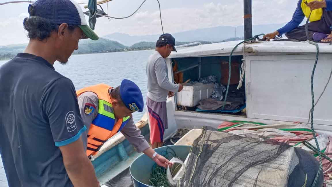 SUKABUMI — Petugas Satpol Air Polres Sukabumi melakukan pemeriksaan kapal nelayan di perairan Teluk Palabuhanratu Senin, (26/01/2020). Dari informasi yang diperoleh, dengan menggunakan kapal patroli, petugas patroli Satpol Air merapat pada kapal nelayan yang berada di perairan Teluk Palabuhanratu. Kelengkapan alat keselamatan kapal, surat kapal sampai hasil tangkapan pada kapal tidak luput dari pemeriksaan petugas.
