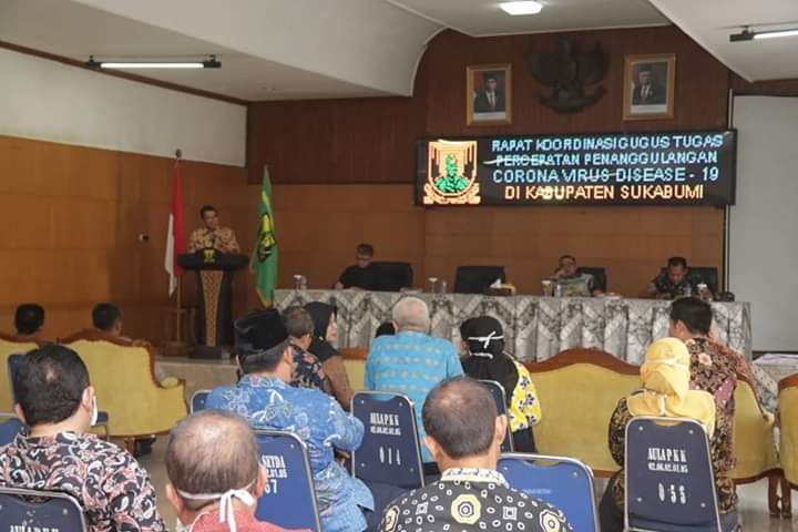 SUKABUMI KAB — Pemerintah Kabupaten Sukabumi terus lakukan penguatan Gugus Tugas Percepatan Penanganan Covid -19, Kamis (19/3/2020). Rapat Koordinasi penguatan ini dipimpin Wakil Bupati Sukabumi H. Adjo Sardjono. Forum Komunikasi Pimpinan Daerah (Forkopimda) Kabupaten Sukabumi dan Satgas Covid 19 mengikuti Rakor yang dilaksanakan di Pendopo Sukabumi tersebut.