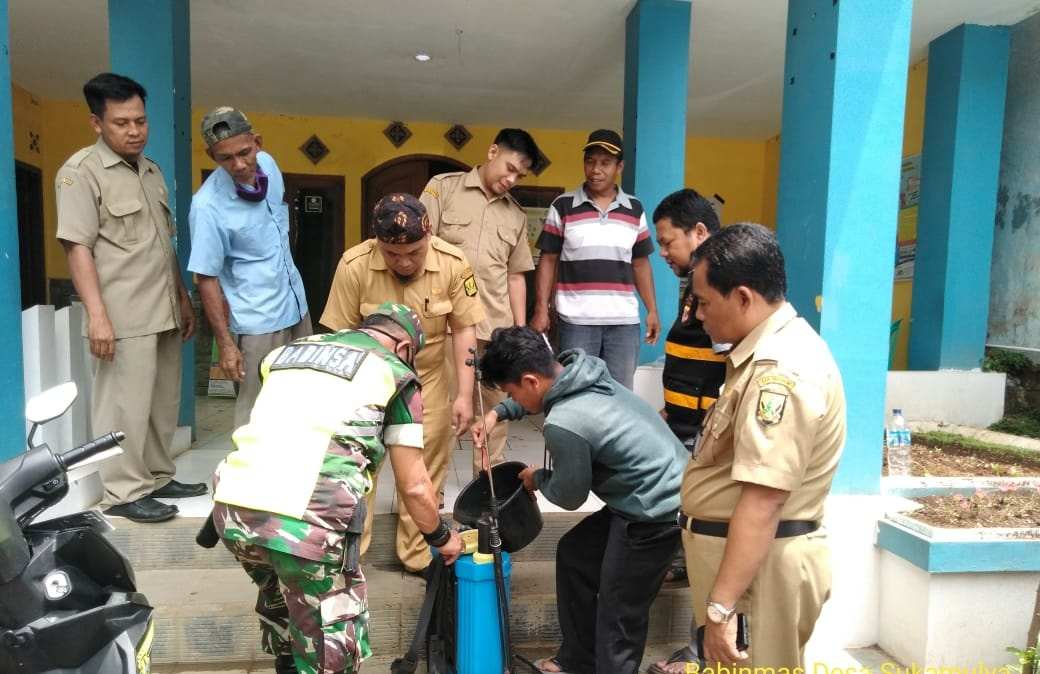 CIKEMBAR — Pemerintah Desa (Pemdes) Sukamulya Kecamatan Cikembar Kabupaten Sukabumi Jawa Barat, lakukan langkah preventif untuk pencegahan Corona virus Disease (covid-19) dengan melakukan penyemprotan disinfektan di fasilitas umum (Fasum) dan pemukima warga belum lama ini.