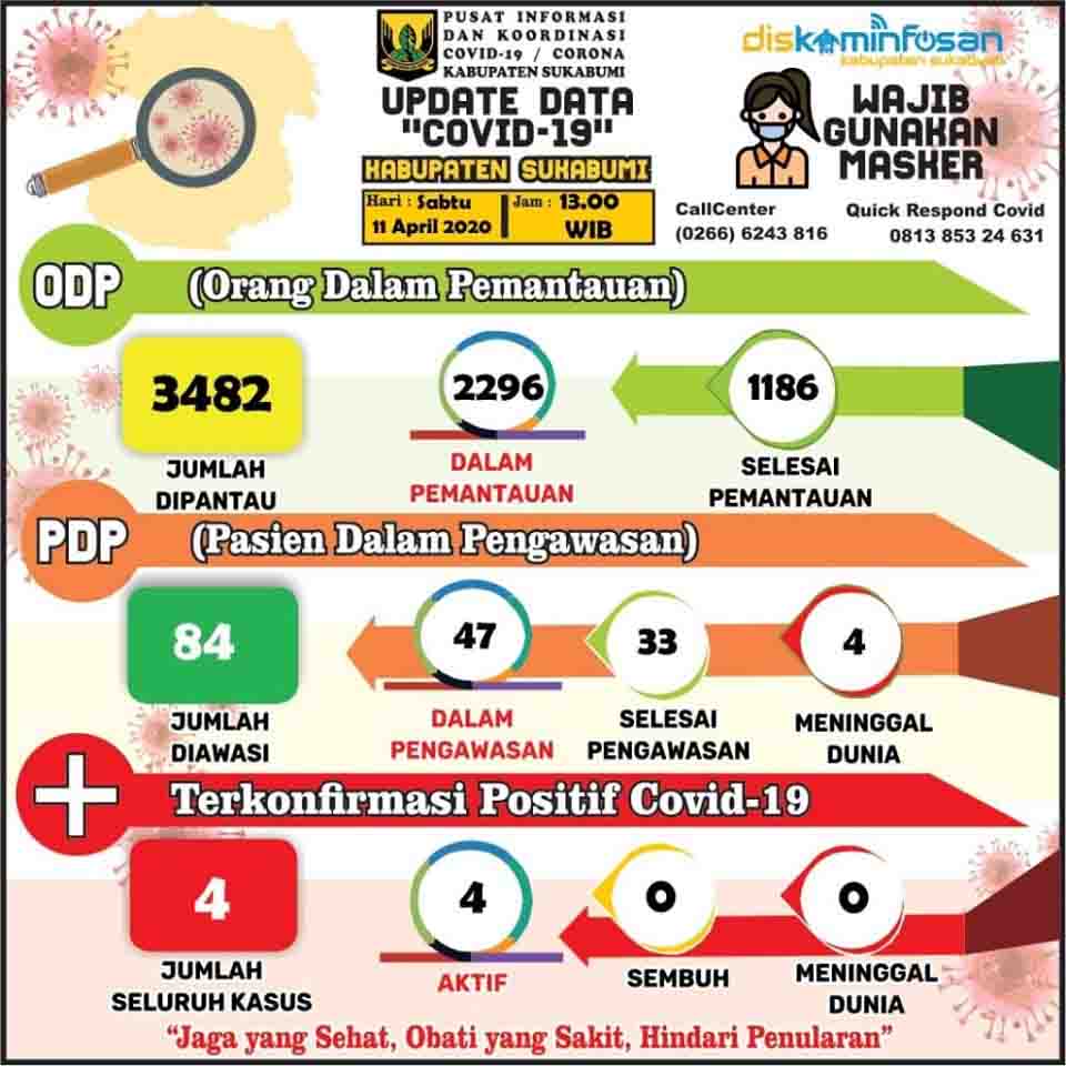 SUKABUMI KAB — Data update terkait angka Covid-19 terhitung 11 April 2020, menurut Pusat Informasi dan Koordinasi Covid 19 Kabupaten Sukabumi (PIKOKAMI) menyampaikan perkembangan terbaru berkenaan dengan Penanganan, Pengendalian dan Pencegahan virus corona di wilayah Kabupaten Sukabumi, Sabtu (11/4/2020).