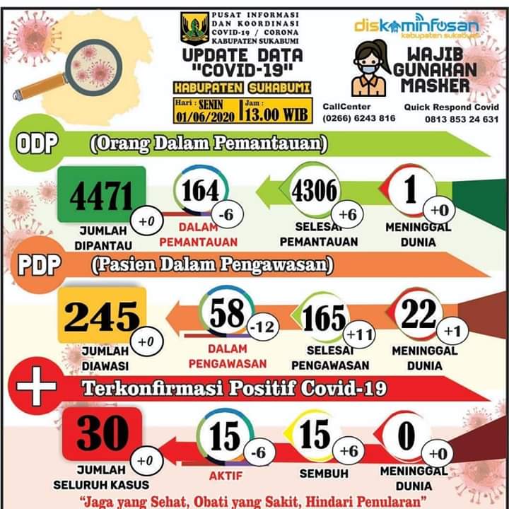SUKABUMI KAB — Pusat Informasi dan Koordinasi Covid 19 Kabupaten Sukabumi (PIKOKAMI) merilis data terbaru berkenaan dengan Percepatan Pencegahan virus corona di wilayah Kabupaten Sukabumi, Senin (01/6/2020).