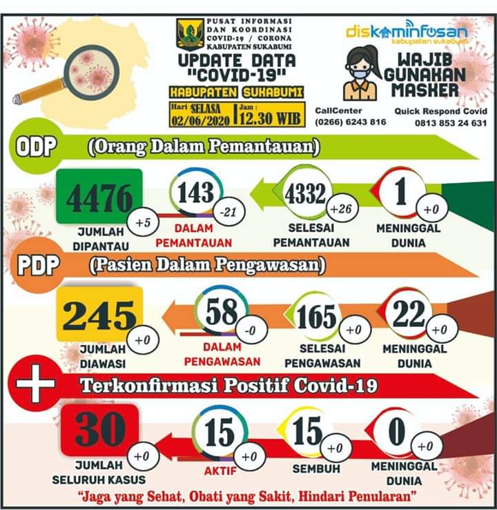 SUKABUMI KAB — Pusat Informasi dan Koordinasi Covid 19 Kabupaten Sukabumi (PIKOKAMI) merilis data terbaru berkenaan dengan Percepatan Pencegahan virus corona di wilayah Kabupaten Sukabumi, Selasa (02/6/2020).