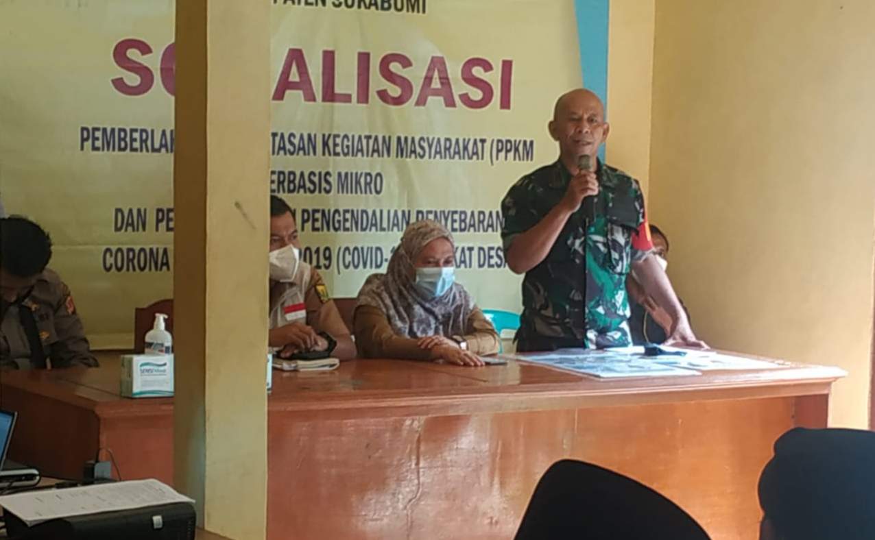 WARUNGKIARA — Jaga kondusifitas wilayah teritorial, Komandan Koramil (Danramil) 0622-03/Warungkiara Kecamatan Warungkiara Kodim 0622/Kabupaten Sukabumi Jawa Barat, bersama Muspika Warungkiara gelar sosialisasi Pemberlakuan Pembatasan Kegiatan Masyarakat (PPKM) Skala Mikro di Aula Desa Mekarjaya Kecamatan Warungkiara, Rabu (27/04/2022).