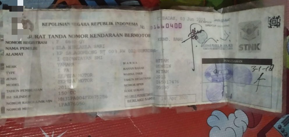 “ Ini motor milik saudara saya Nurlaela sari yang berlamat Kp. Salagombong RT 003 RW 002 Desa Sukadamai Kecamatan Cicantayan,” kata Enden.