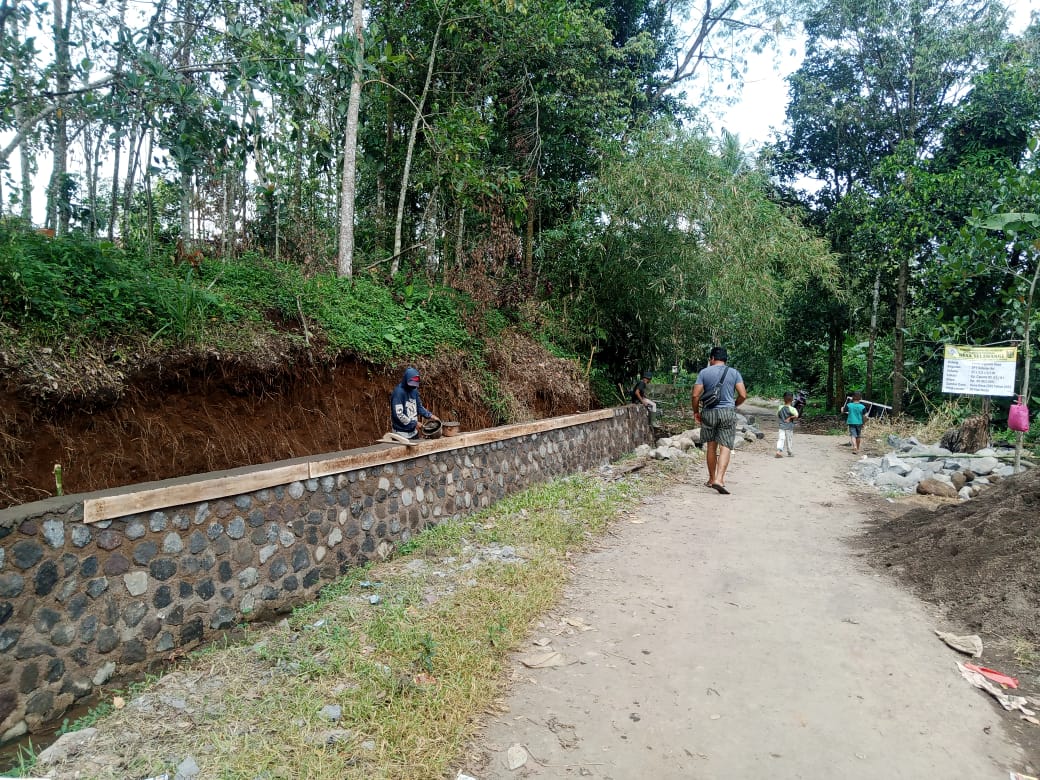 SUKARAJA — Pemerintah Desa (Pemdes) Selawangi Kecamatan Sukaraja Kabupaten Sukabumi Jawa Barat, realisasikan anggaran Dana Desa (DD) dari program ketahanan pangan untuk membangun Tembok Penahan Tanah (TPT), Rabu (20/07/2022).