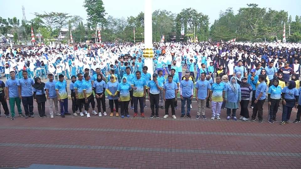 SUKABUMI KAB — Sekretaris Daerah (Sekda) Kabupaten Sukabumi Ade Suryaman didampingi unsur Forkopimda mengikuti acara Pemecahan Rekor Muri Senam Kesehatan Jasmani (SKJ) Pelajar secara serentak di Lapangan Cangehgar Palabuhanratu. Sabtu (27/08/2022). Kegiatan tersebut dilakukan untuk menyambut hari olahraga nasional dan hari jadi ke 152 tahun Kabupaten Sukabumi.