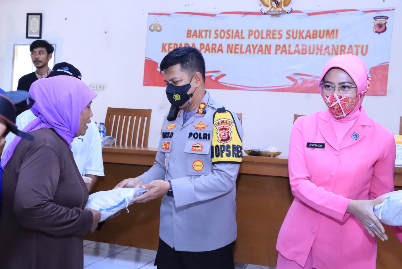 Penyerahan bantuan sembako berupa beras sebanyak 3 Kg dilakukan oleh Kapolres beserta Ketua Bhayangkari Cabang Sukabumi Ny. Hesti Dedi, Kasat Polair Polres Sukabumi dan Kapolsek Cisolok kepada nelayan di Cisolok.