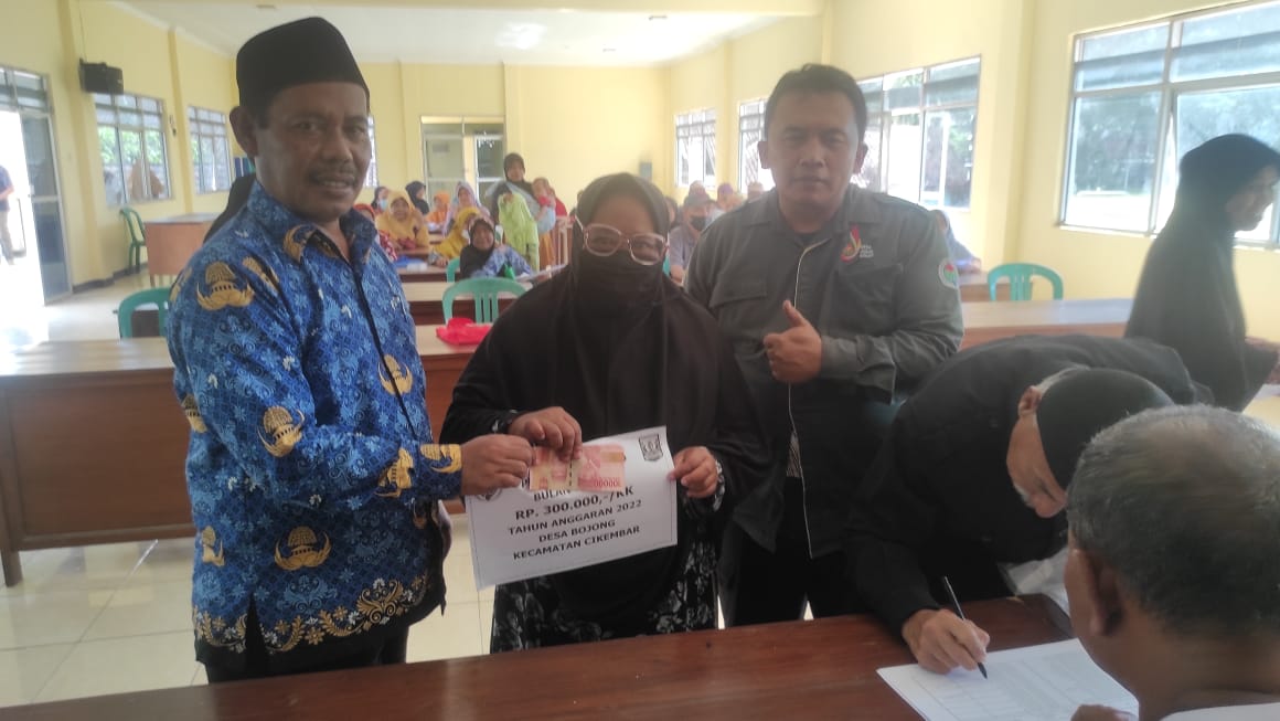 CIKEMBAR, sukabumizone.com || Bantuan Langsung Tunai Dana Desa (BLT DD) Oktober 2022 kembali dibagikan Pemerintah Desa (Pemdes) Bojong Kecamatan Cikembar Kabupaten Sukabumi Jawa Barat, Jum’at (28/10/2022).