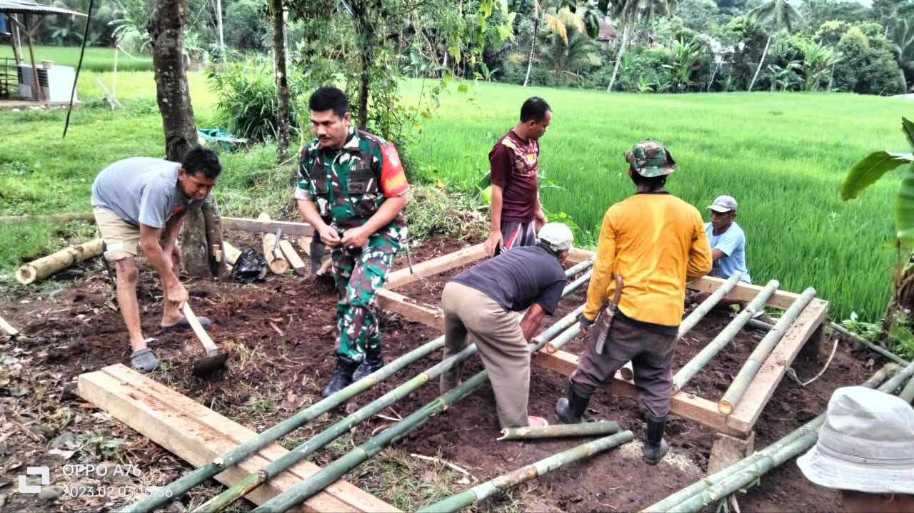 NYALINDUNG, sukabumizone.com || Babinsa Wangunreja Koramil 0622-08/Nyalindung, Sertu Ahmad Mudai Abun menggelar karya bhakti dengan pembangunan Pos Keamanan Lingkungan (Kamling) di Kampung Cisemplak, Desa Wangunreja, Kecamatan Nyalindung, Kabupaten Sukabumi, Sabtu (4/2).