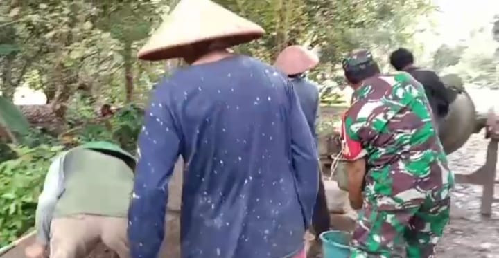 TEGALBULEUD, sukabumizone.com || Kebersamaan dan kedekatan Babinsa bersama masyarakat di wilayah binaannya, ditunjukan oleh Serda Amat Herwanto Babinsa Koramil 0622-12/Tegalbuleud Kodim 0622/ Kabupaten Sukabumi, bersama masyarakat binaan Desa Calingcing, dalam melaksanakan kerja bakti pengecoran jalan Kp Pojok Desa Calingcing Kecamatan Tegalbuleud, Kabupaten Sukabumi, Kamis, (23/02/2023).