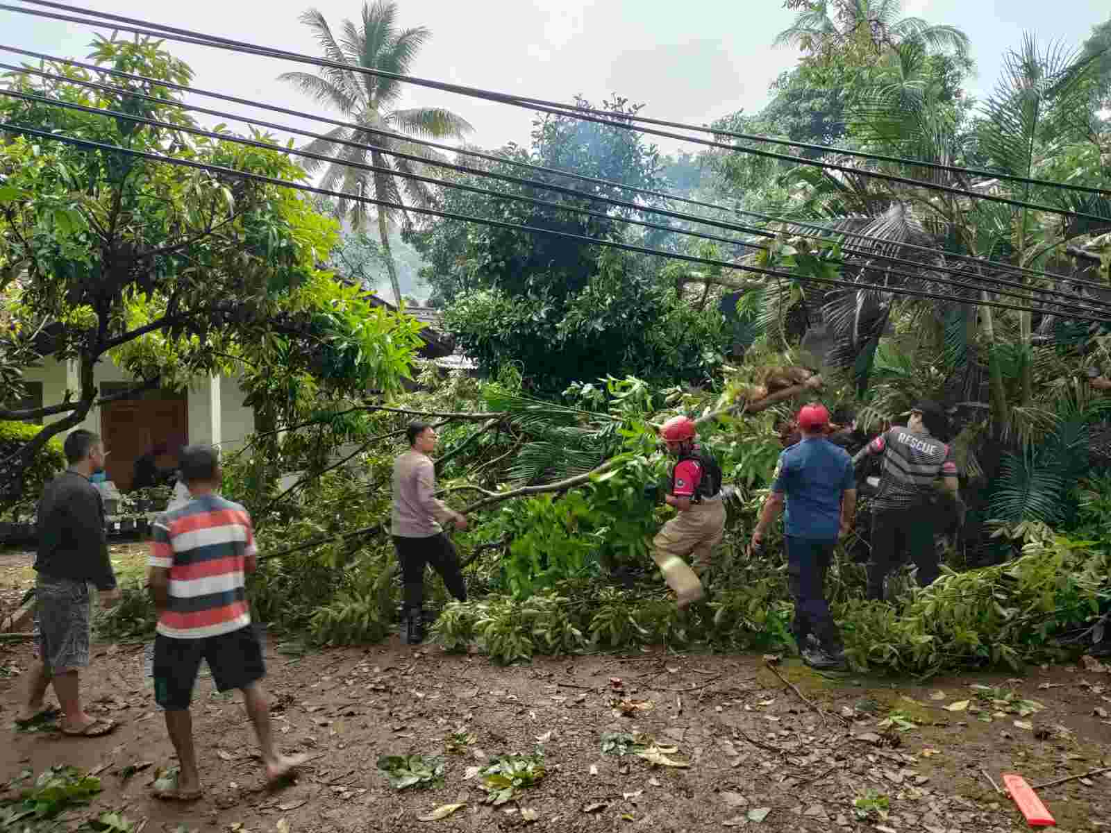 CIKEMBAR, sukabumizone.com || Akibat hujan deras disertai angin kencang, tiga pohon tumbang di Cikembar, Kabupaten Sukabumi, Minggu (23/4/2023). Selain itu, peristiwa tersebut telah merusak puluhan rumah bahkan, sebagian rumah gentengnya beterbangan.