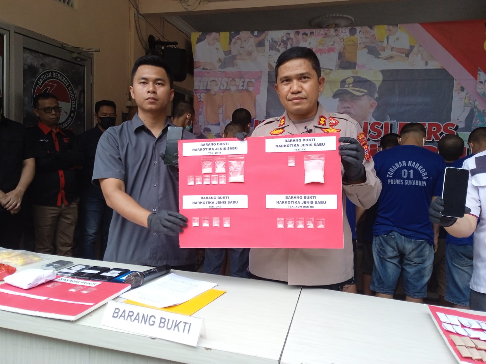 “(Sebelumnya) Kami telah mengamankan satu orang tersangka berinisial DMJ di wilayah Palabuhanratu, dengan barang bukti berupa empat paket sabu seberat kurang lebih 1,3 gram,” ujarnya saat pers rilis di Mapolres Sukabumi, Jalan Jajaway Palabuhanratu, Selasa (22/8/2023).