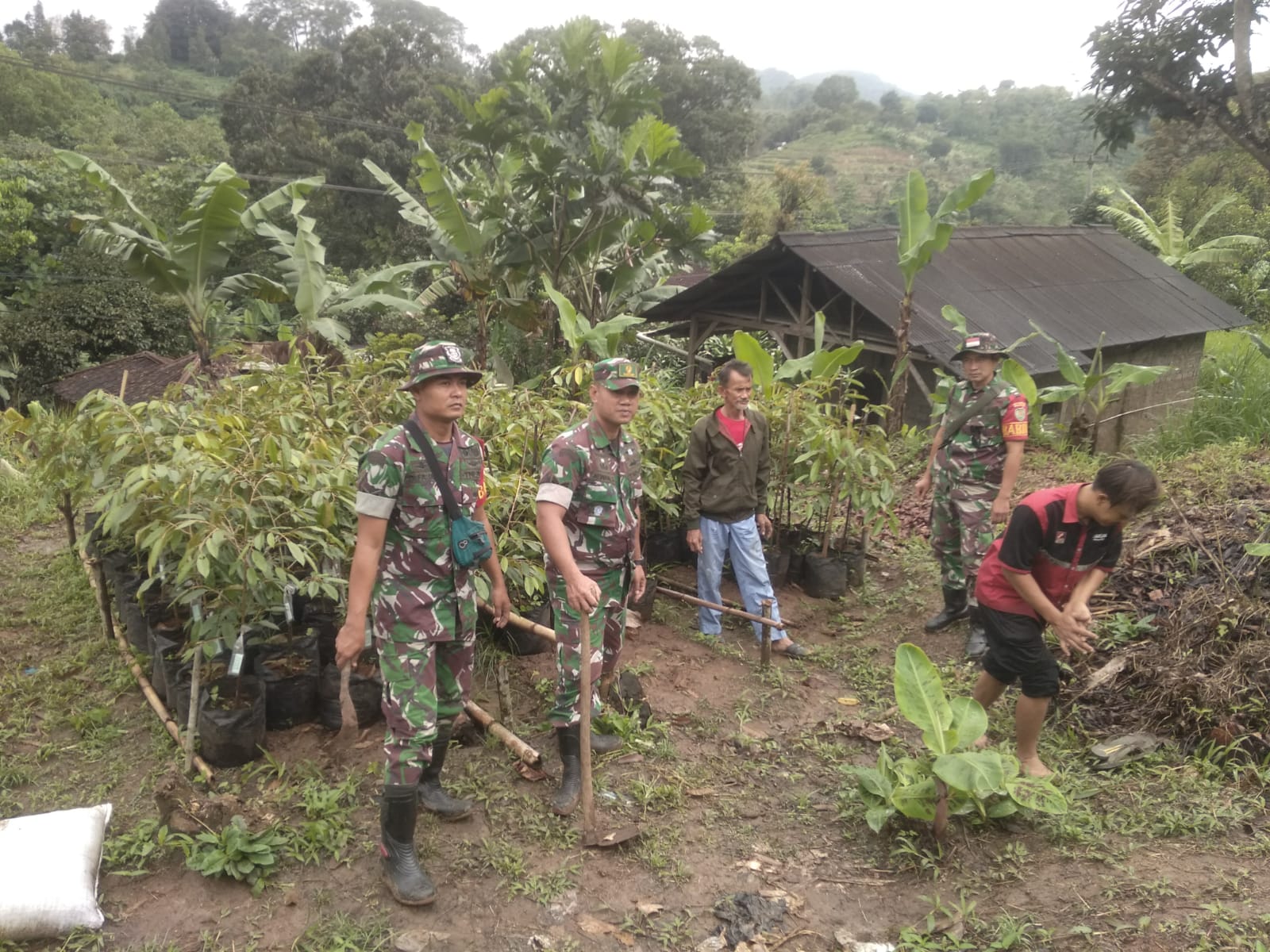 NYALINDUNG, sukabumizone.com || Anggota Koramil 2208/Nyalindung, Sertu Dadan F menggelar program penanaman pohon sebanyak 200 pohon jenis duren montong di Kampung Banua RT8/3, Desa Neglasari, Kecamatan Nyalindung, Kabupaten Sukabumi.