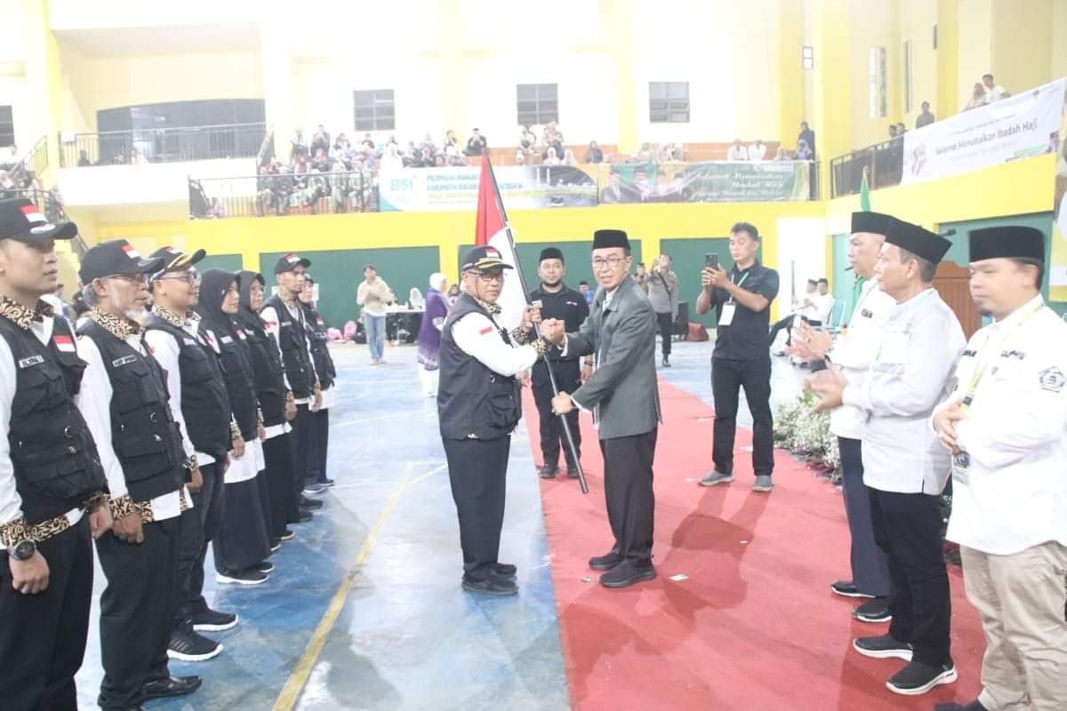 Pada kesempatan tersebut Ade menyerahkan bendera dan diterima oleh ketua rombongan Kloter 3.