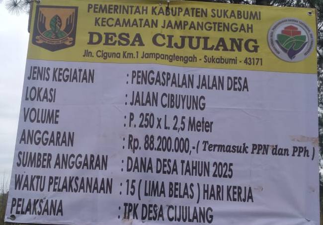 JAMPANGTENGAH, sukabumizone.com || Pemerintah Desa Cijulang, Kecamatan Jampang Tengah, Kabupaten Sukabumi, melaksanakan pembangunan pengaspalan jalan desa di Kampung Cibuyung. Proyek infrastruktur ini didanai melalui Dana Desa (DD) Tahun Anggaran 2025 sebesar Rp 88.200.000,- dengan volume pekerjaan sepanjang 250 meter dan lebar 2,5 meter.