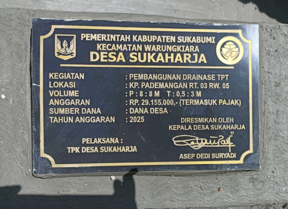 Pembangunan drainase TPT ini merupakan bagian dari upaya Pemdes Sukaharja dalam meningkatkan infrastruktur desa serta menjaga kenyamanan masyarakat.