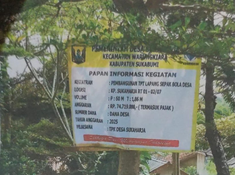 Pekerjaan TPT tersebut berlokasi di Kampung Sukaharja RT 01 dan 02 RW 07 dengan volume bangunan panjang 60 meter dan tinggi 1,86 meter. Proyek ini menelan biaya Rp74.719.000 yang bersumber dari Dana Desa Tahun Anggaran 2025.