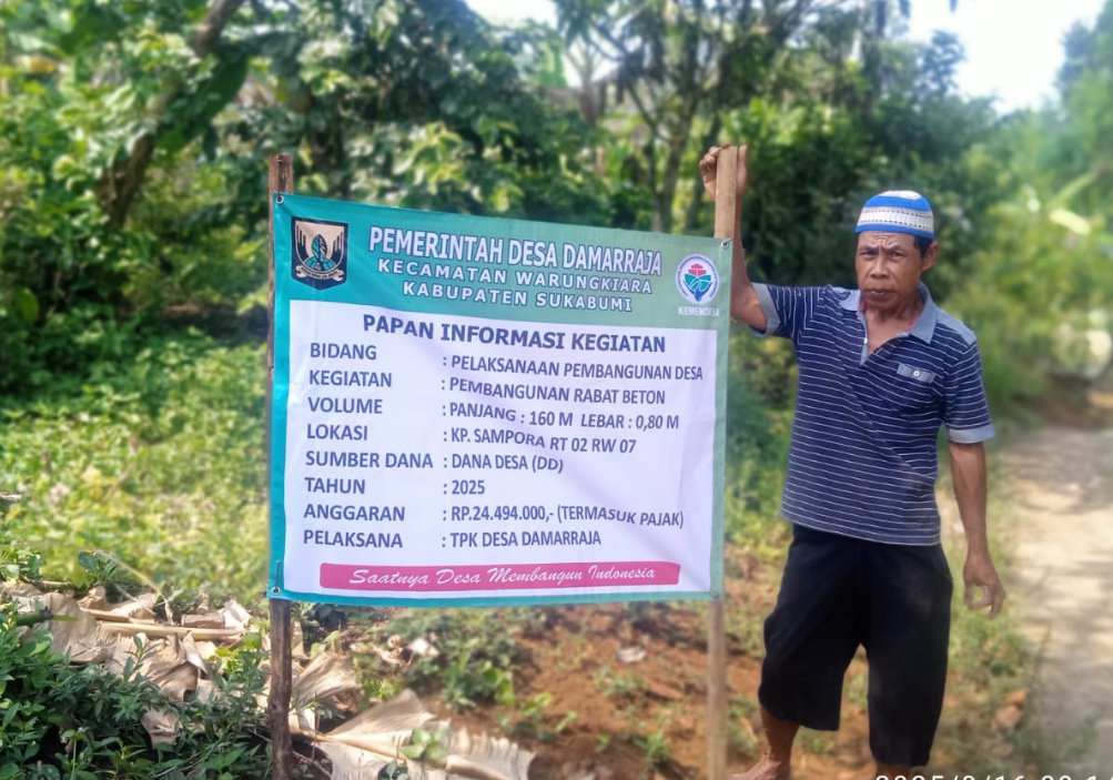 WARUNGKIARA, sukabumizone.com | Pemerintah Desa (Pemdes) Damarraja, Kecamatan Warungkiara, Kabupaten Sukabumi, menuntaskan pembangunan rabat beton di Kampung Sampora RT 02/07. Proyek ini menggunakan anggaran Dana Desa tahap II tahun 2025 sebesar Rp24,49 juta.