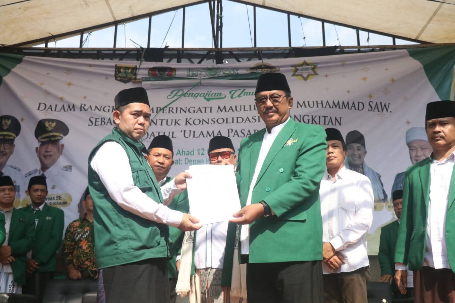 SUKABUMI KAB, sukabumizone.com || Bupati Sukabumi H. Asep Japar bersama Wakil Bupati H. Andreas menghadiri Pelantikan Pengurus Ranting Istimewa Nahdlatul Ulama (PRNU) Pasar Cicurug Masa Khidmat 2025–2028. Kegiatan yang dirangkaikan dengan Sahriyahan MWC Cicurug dan Peringatan Maulid Nabi Muhammad SAW itu digelar di Pasar Cicurug, Kecamatan Cicurug, pada Minggu (12/10/2025).