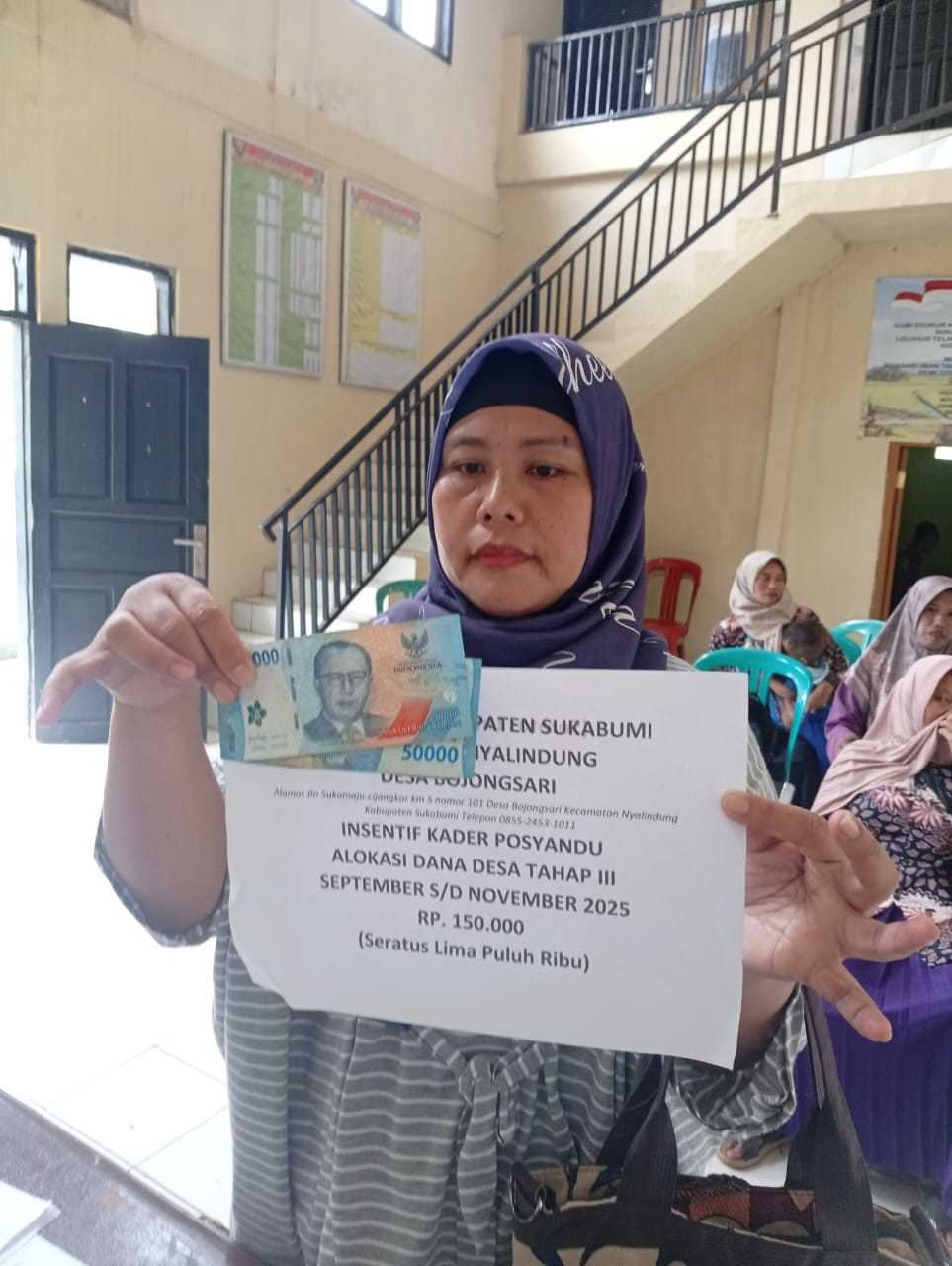 NYALINDUNG, sukabumizone.com | Pemerintah Desa (Pemdes) Bojongsari, Kecamatan Nyalindung, kembali menyalurkan insentif bagi para kader posyandu. Kegiatan tersebut berlangsung pada Rabu (5/11/2025) di aula desa setempat.