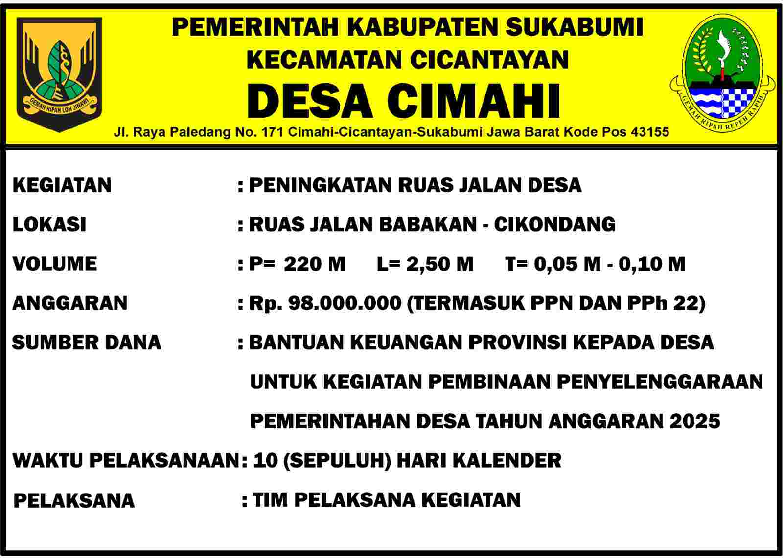 Pembangunan yang dimulai pekan ini mencakup perbaikan jalan sepanjang 220 meter dengan lebar 2,5 meter dan ketebalan 0,05–0,10 meter. Proyek tersebut ditargetkan rampung dalam waktu 10 hari kalender, dan pengelolaannya dilakukan secara swakelola oleh Tim Pengelola Kegiatan (TPK) Desa Cimahi.