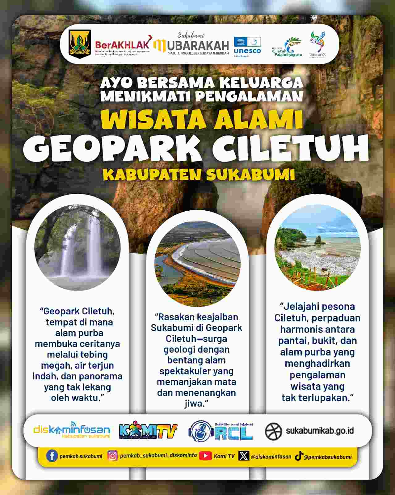 SUKABUMI, sukabumizone.com || Pemerintah Kabupaten Sukabumi melalui Diskominfo kembali mendorong promosi destinasi wisata unggulan yang berada di kawasan Ciletuh–Palabuhanratu UNESCO Global Geopark. Empat lokasi wisata populer diperkenalkan secara lebih luas untuk mengajak masyarakat menikmati pesona alam Sukabumi menjelang musim liburan.