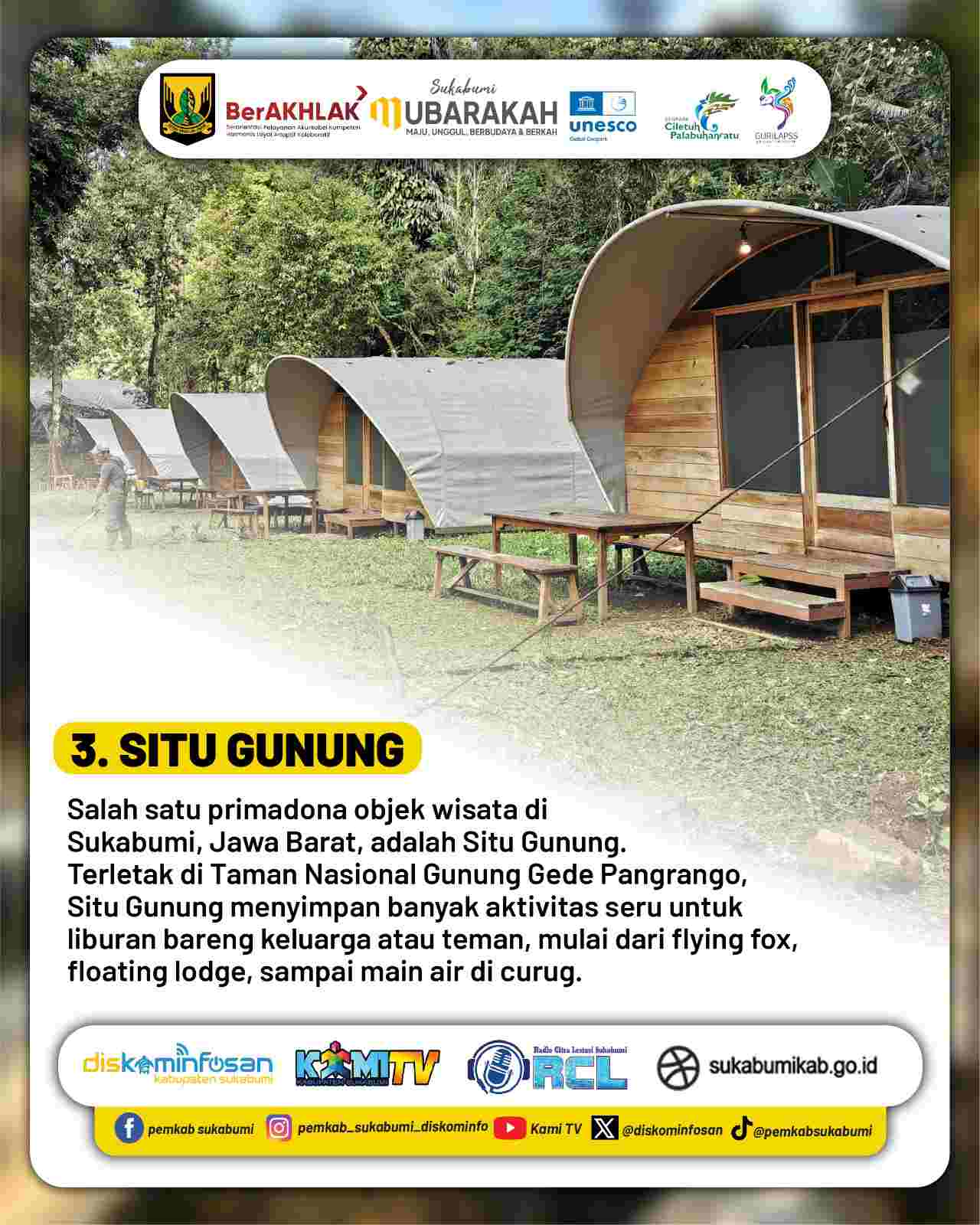 Objek wisata ini terletak di Taman Nasional Gunung Gede Pangrango dan menjadi primadona wisata alam Sukabumi. Situ Gunung menawarkan beragam aktivitas seru, mulai dari flying fox, floating lodge, hingga bermain air di kawasan curug. Suasananya yang sejuk membuat lokasi ini cocok untuk liburan keluarga maupun kegiatan luar ruang bersama teman.