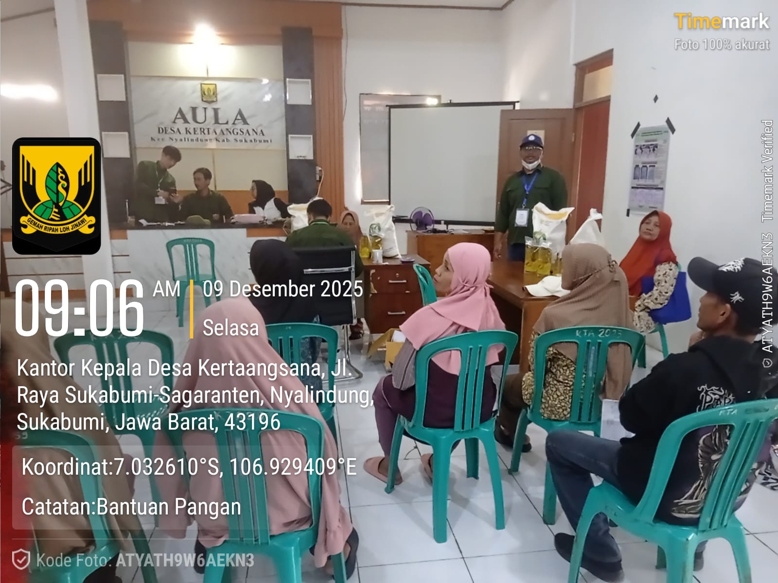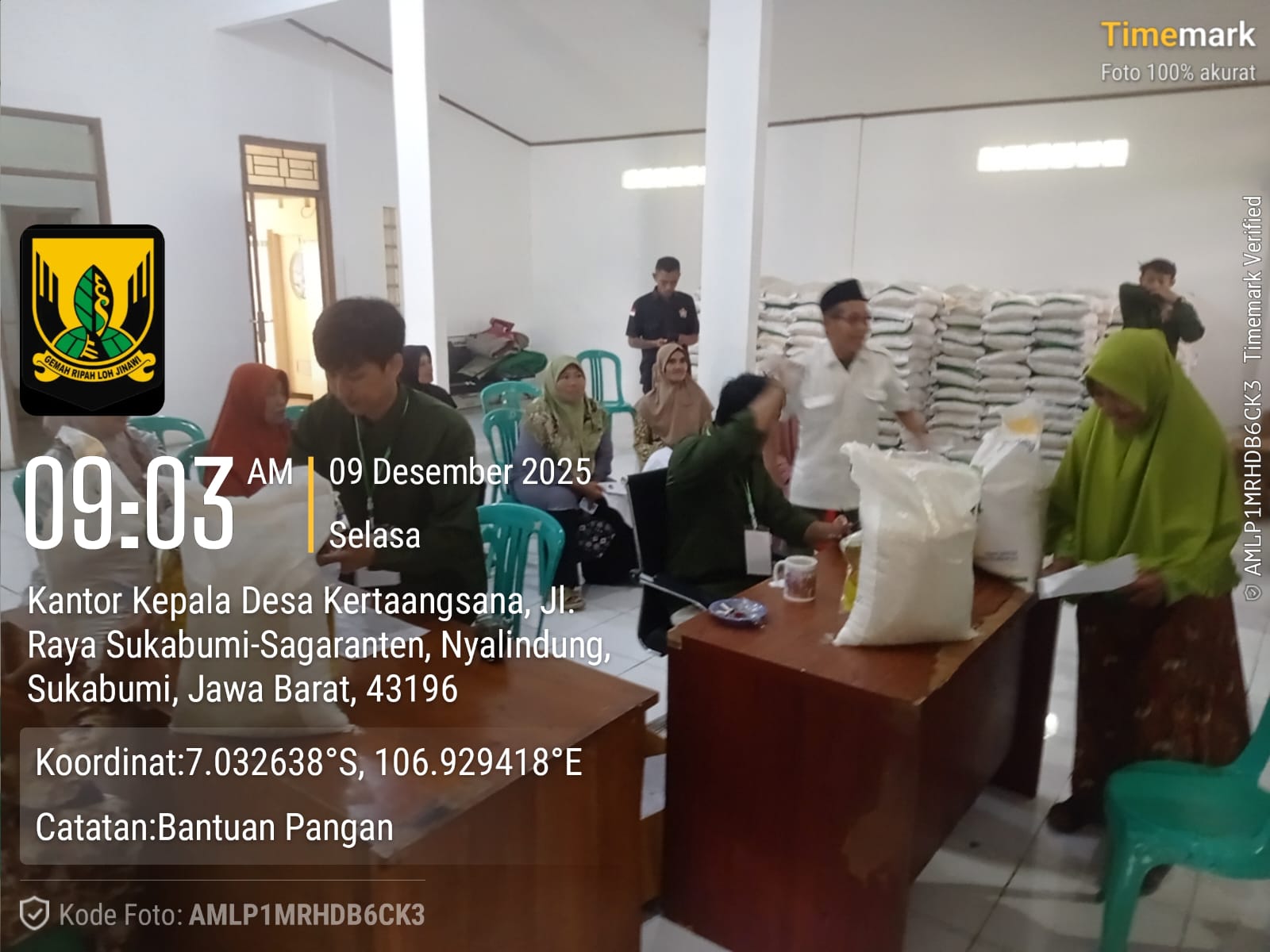NYALINDUNG, sukabumizone.com || Pemerintah Desa Kertaangsana, Kecamatan Nyalindung, Kabupaten Sukabumi menuntaskan penyaluran Bantuan Pangan Bulog alokasi Oktober–November 2025. Kegiatan berlangsung secara serentak di Aula Desa Kertaangsana, Selasa (9/12/2025).