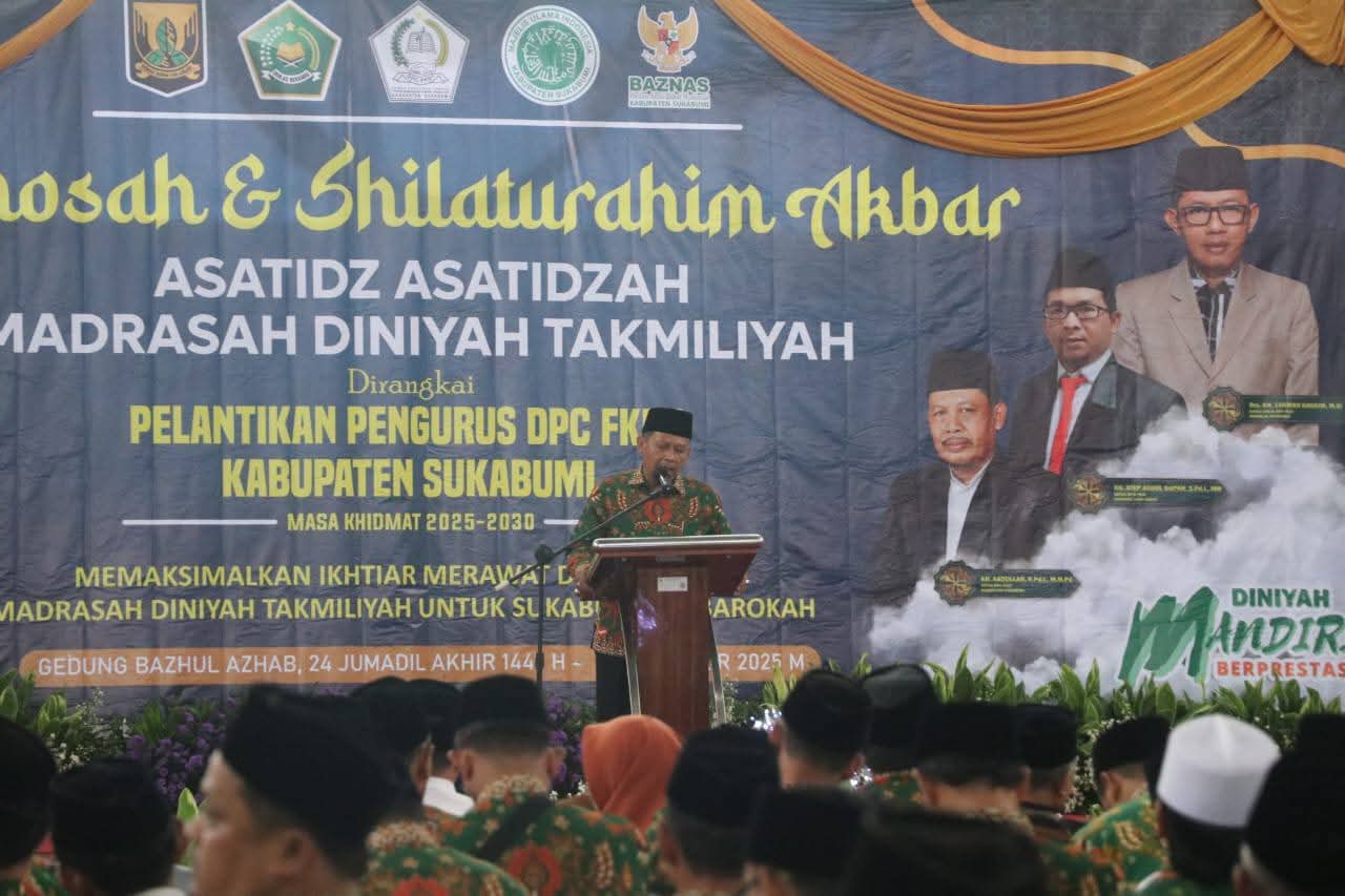 Hal tersebut disampaikan Bupati saat menghadiri pelantikan pengurus DPC FKDT Kabupaten Sukabumi masa khidmat 2025–2030 yang digelar di Pusbang Dai Cikembang, Kecamatan Cikembar, Senin (15/12/2025). Pelantikan ini mengusung tema “Memaksimalkan Ikhtiar Merawat dan Menjaga Madrasah Diniyah Takmiliyah untuk Sukabumi Mubarakah”.