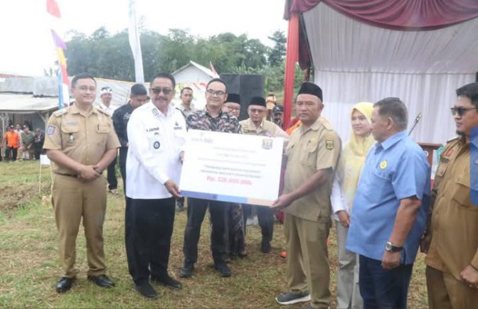 Selanjutnya bupati meyerahkan bantuan paket sembako untuk penerima manpaat dan Penyerahan CSR dari BJB Palabuanratu untuk Pembangunan Hunia Tetap sebanyak 16 rumah