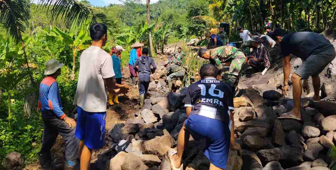 Terlihat puluhan warga bersama prajurit TNI bahu-membahu bergotong royong mengangkut material serta melakukan pengerukan dan penggalian sebagai tahap awal pembangunan Tembok Penahan Tanah (TPT) dan peningkatan jalan desa di Kedusunan Cijolang.